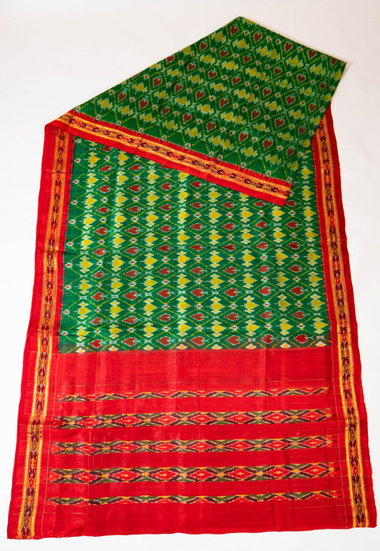 Gulmehendi~ Red & Green Pure Silk Pochampally Saree – A Vibrant Ikkat Weave from Telangana